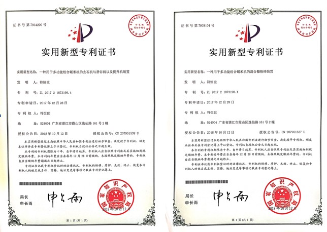 值得一提的是湛江市金順糧食機(jī)械制造有限公司通過iSo9001體系已獲得多個(gè)專利,其中有外觀專利(多功能碾米機(jī));實(shí)用專利(一種多功能組合碾米機(jī)、一種用于多功能組合碾米機(jī)的去石機(jī)與礱谷機(jī)以及提升機(jī)裝置、一種用于多功能組合碾米機(jī)的混合糠粉碎裝置、一種用于多功能組合碾米機(jī)的電控與風(fēng)機(jī)裝置、一種用于多功能組合碾米機(jī)的比重篩和碾米機(jī)裝置);發(fā)明專利(湛江碾米機(jī)、符氏ZJF-15-40M&S型號(hào)組合碾米機(jī))等。